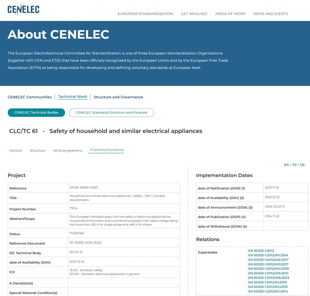 歐盟家電安全新標準EN IEC 60335-1:2023于2023年12月22日正式出版,DOP 發(fā)布日期是2024年11月22日, 該標準涵蓋了最新出現的許多家電產(chǎn)品的技術(shù)要求。