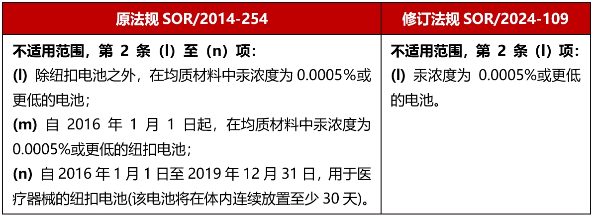 [導讀]: 2024年6月19日,加拿大官方公報發(fā)布SOR/2024-109,對產(chǎn)品含汞法規 SOR/2014-254 進(jìn)行修訂,修訂法規將自官方公報公布之日起一年后,也就是2025年6月19日生效。 該修訂法規主要修訂了電池中汞含量的要求,刪除了電池均質(zhì)材料,也不...