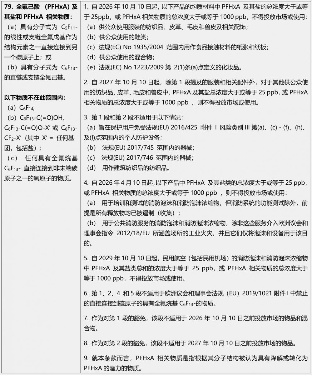 2024年9月20日,歐盟在其官方公報上發(fā)布法規(EU) 2024/2462,修訂REACH法規((EC) No 1907/2006)附錄XVII,新增第79項有關(guān)全氟己酸(PFHxA)及其鹽和相關(guān)物質(zhì)的限制條款。