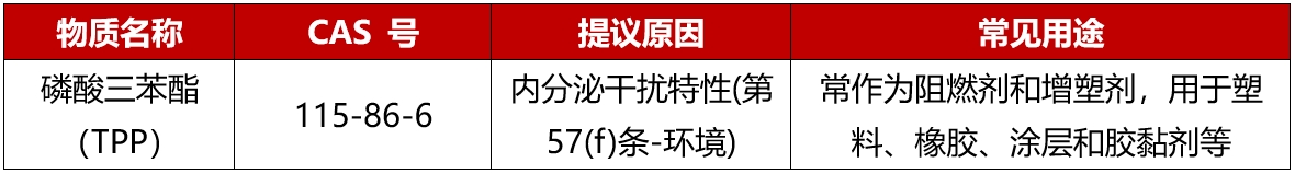 2024年11月7日,歐洲化學(xué)品管理局(ECHA)發(fā)布公告將磷酸三苯酯(TPP)正式列入REACH高度關(guān)注物質(zhì)(SVHC)清單。至此, SVHC清單正式增至242項。