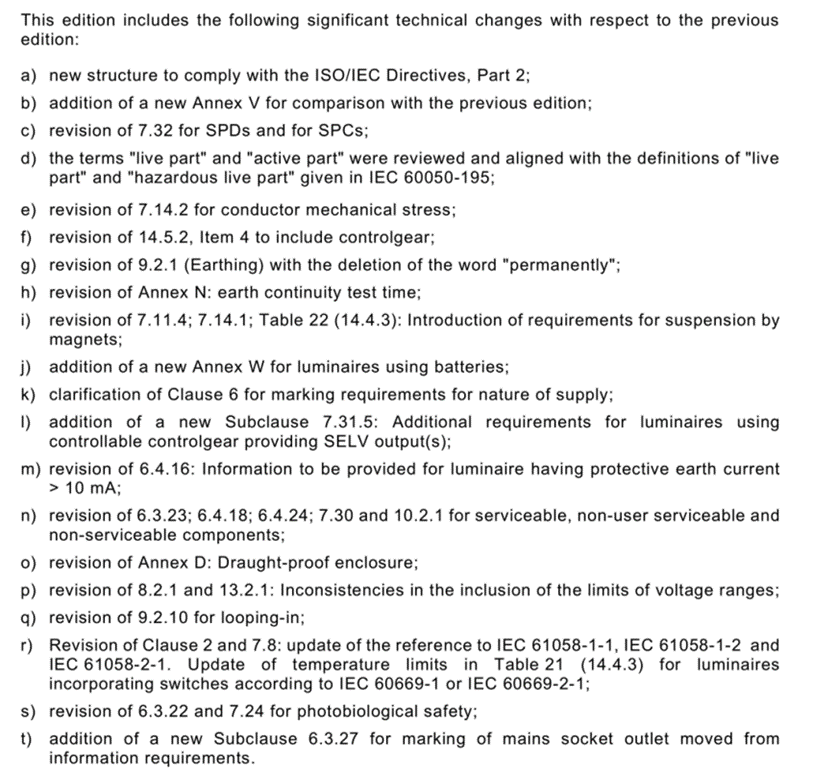 2024年11月6日,IEC發(fā)布了新版燈具標準IEC 60598-1:2024,此版本基于2020版,主要有如下重大變更: