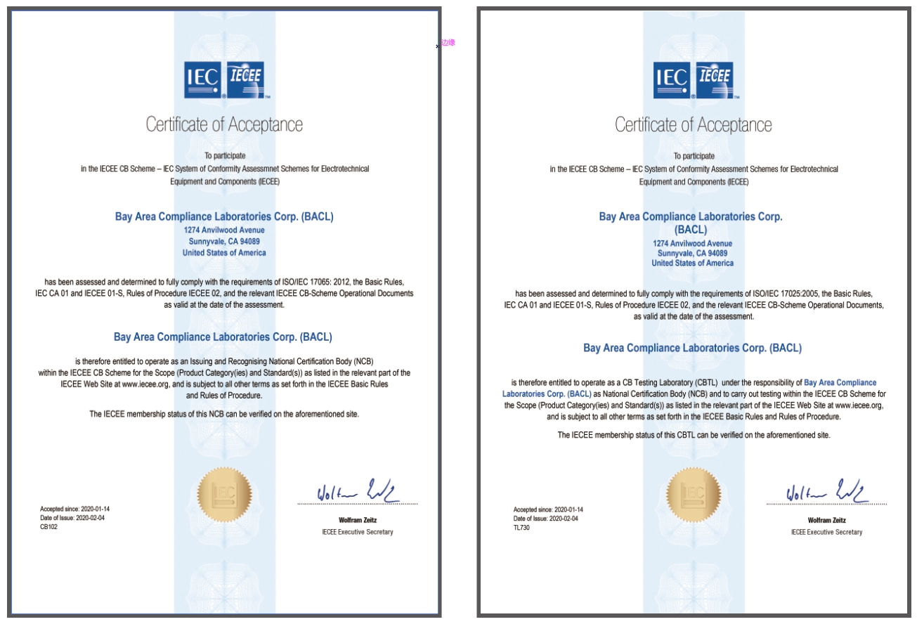 BACL是美國OSHA和加拿大SCC雙認可的北美安規認證機構,歐盟CE認證的通告機構(Notified Body: 1313),IECEE CB Scheme的認證機構NCB和測試實(shí)驗室CBTL(CB102, TL730);同時(shí)還獲得A2LA, IAS, CNAS, CMA, FDA, ACMA, SAA等場(chǎng)地授權和認可,分別在美國、韓國、中國臺灣、深圳福田和南山、東莞、成都、昆山等地設有安規測試實(shí)驗室,可為您提供IT/AV, HOUS、照明產(chǎn)品、電源產(chǎn)品、電動(dòng)工具等產(chǎn)品的全球認證包括:美國(NRTL, FCC, ENERGY STAR, FDA, DOE, CEC), 加拿大(SCC, ISED, NRCan),歐盟(CE), 韓國(KC), 歐盟CE NB, 國際電工委員會(huì )IECEE CB Scheme, 日本(MIC), 新加坡(IMDA), 中國香港(OFCA),中國臺灣(NCC, BSMI), 埃及(NTRA, GOEIC), 越南(MIC), 沙特(SASO), 菲律賓(NTC),泰國(NBTC), 馬來(lái)西亞(SIRIM), 印度(BIS, WPC, TEC)等多國家及地區的認證服務(wù),保障您的產(chǎn)品在國際貿易壁壘日趨激烈的今天,依然順利的進(jìn)入國際貿易市場(chǎng)!