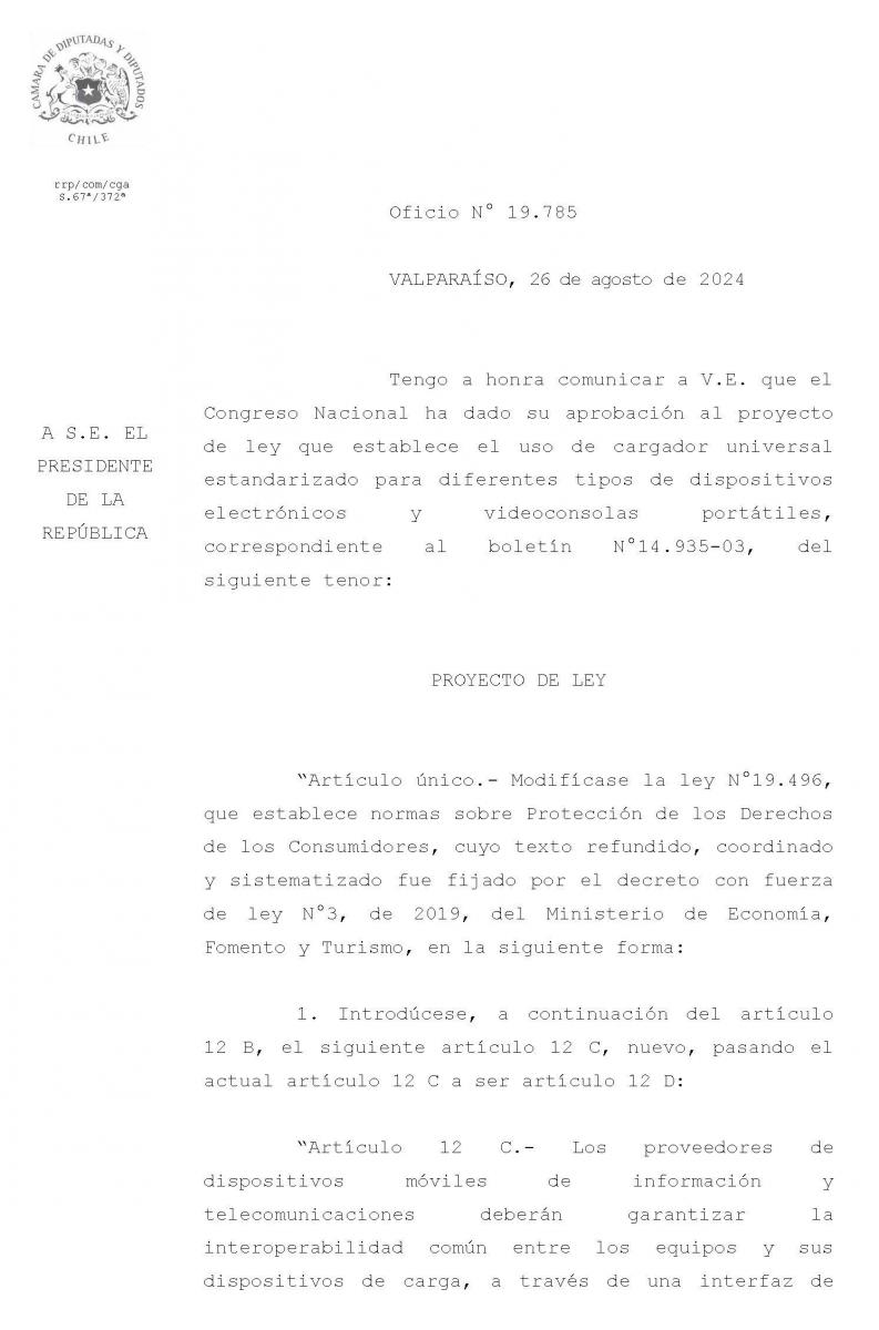 2024年8月26日,智利眾議院批準了一項法案,為手機、平板電腦和便攜式游戲機等各種設備建立通用標準充電器。