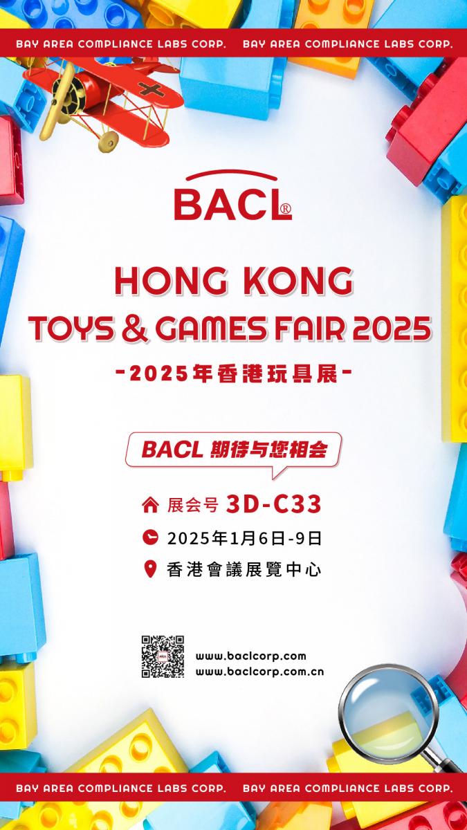 2025年1月6日-9日,亞洲第一、全球第二的玩具專(zhuān)業(yè)展一一第51屆香港玩具展將在香港會(huì )展中心盛大舉辦。BACL作為檢測與認證服務(wù)行業(yè)的引領(lǐng)者、國際公認的權威第三方,將攜多國玩具檢測、認證及檢驗一站式解決方案精彩亮相3D-C33展位,為玩具企業(yè)提供安全性、可靠性及合規性的檢測、認證及檢驗服務(wù),幫助企業(yè)順利揚帆國際市場(chǎng)。